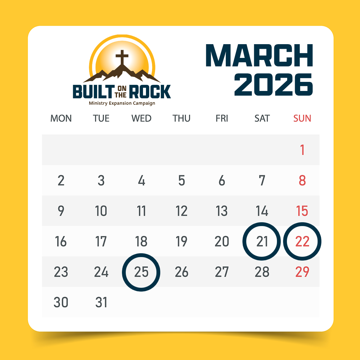 Together, our commitments will provide the foundation needed to move forward confidently in this ministry expansion. If you are unable to attend that weekend, please return your commitment card to the church office in advance so it may be included. Commitment cards (and an envelope for privacy are found in Built on the Rock packets.
